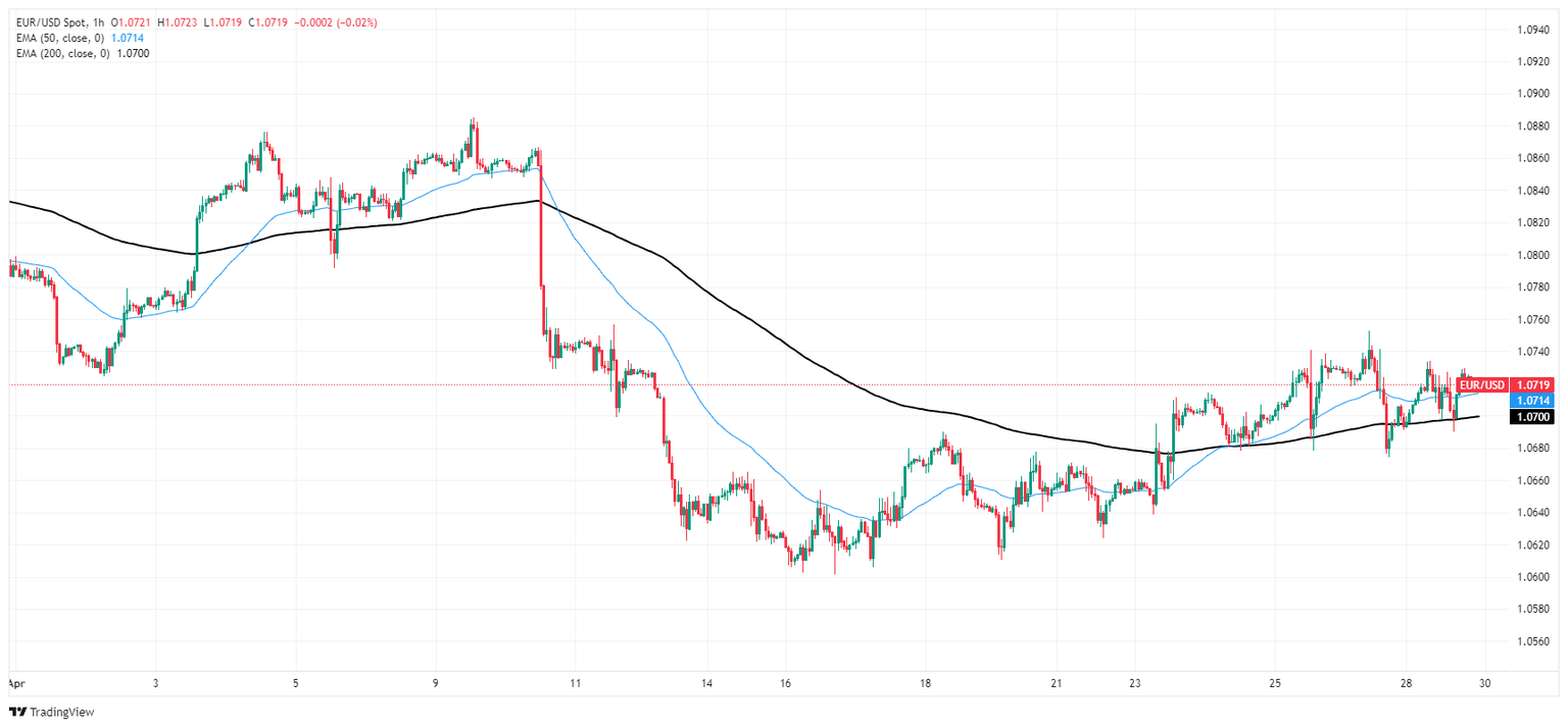 The EUR/USD churned just north of the 1.0700 handle on Monday as the pair continues to grind higher off of technical bounces from the 200-hour Exponential Moving Average (EMA) rising into the 1.0700 region. Chart paper north of 1.0750 is proving a difficult boundary to cross, and downside momentum, though sluggish, continues to keep the pair weighed down.
