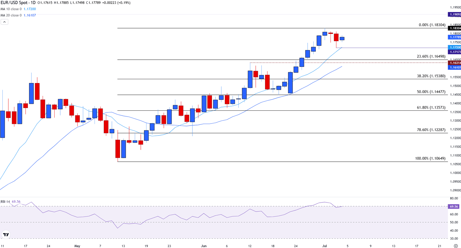 Technically, EUR/USD remains in a firm uptrend, although some signs of consolidation have emerged. The pair is holding above its 10-day Simple Moving Average (SMA) at 1.1720, and comfortably above the 20-day SMA at 1.1610, both of which are providing support for the pair.