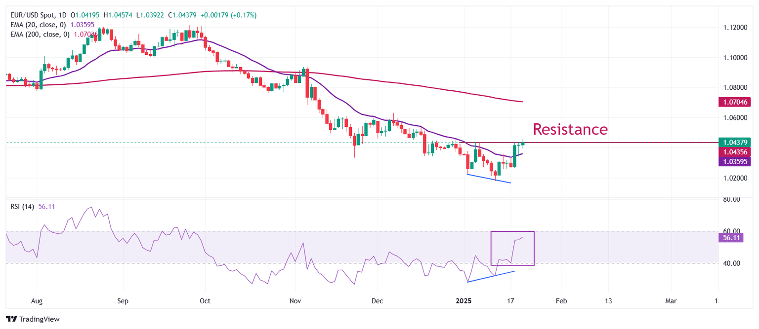 EUR/USD posts a fresh three-week high of 1.0460 in Wednesday’s North American trading hours. The major currency pair recovered after a divergence in momentum and price action. The 14-day Relative Strength Index (RSI) formed a higher low, while the pair made lower lows. The negative divergence would be confirmed if the pair manages to sustain above the immediate support of 1.0450