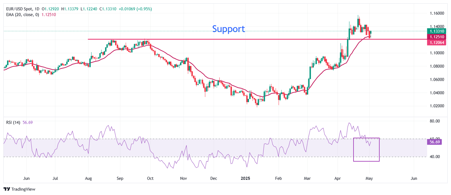 EUR/USD returns above the key level of 1.1300 on Friday after recovering from its two-week low of 1.1265 posted on Thursday and aims to recapture 1.1400. The major currency pair rebounded after attracting bids near the 20-day Exponential Moving Average (EMA) around 1.1260.