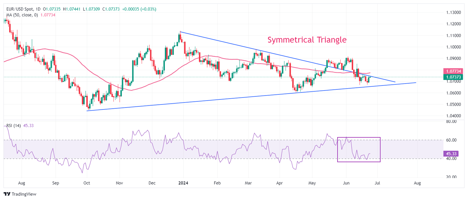 EUR/USD faces pressure near Monday’s high around 1.0740. The major currency pair continues to face selling pressure near the downward-sloping border of the Symmetrical Triangle near 1.0750, which is plotted from 28 December 2023 high around 1.1140. The pair trades below the 50-day Exponential Moving Average (EMA), which indicates that the short-term outlook is bearish.