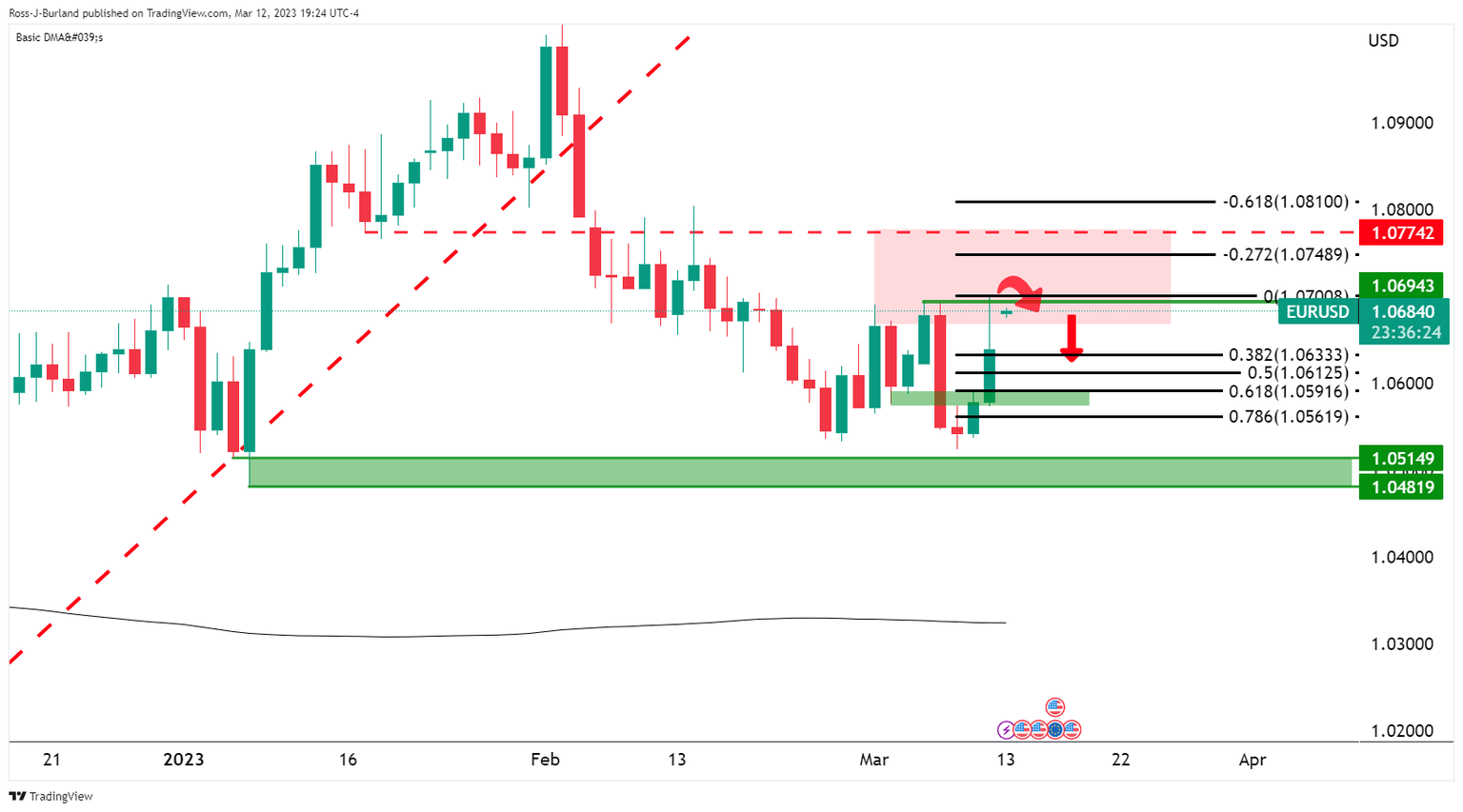 EUR/USD 1.0590 target in a 61.8% Fibonacci retracement for the day ahead. On the other hand, a continuation towards 1.0770s could just as easily play out.
