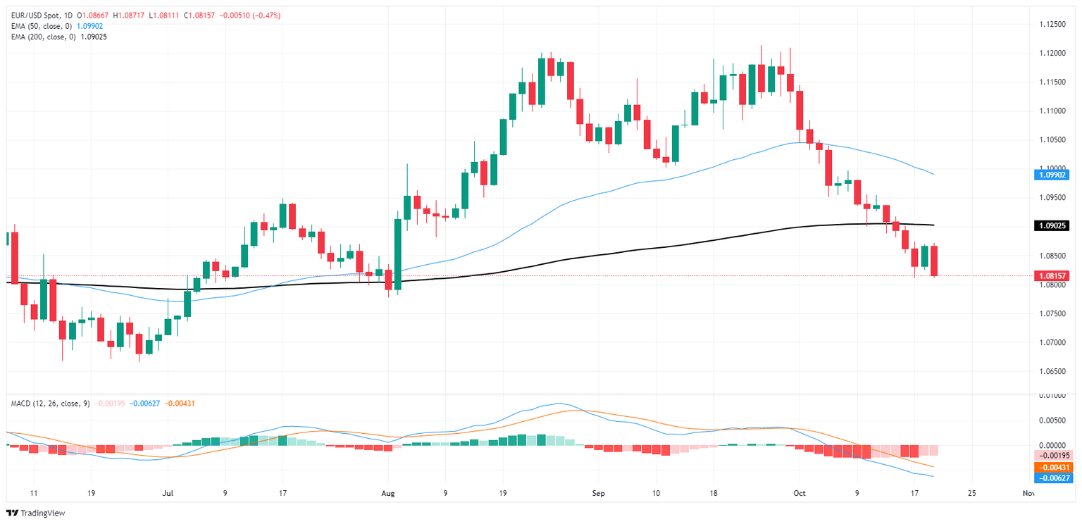 EUR/USD fumbled on Monday, kicking off a new trading week with a downside push as price action waffled back into familiar 12-week lows just above the 1.0800 handle. Markets remain apprehensive on the future pace of rate cuts, specifically from the Federal Reserve (Fed), and Purchasing Managers Index (PMI) activity figures due later in the week will give investors a glimpse at the shape of the global economy in the coming weeks.