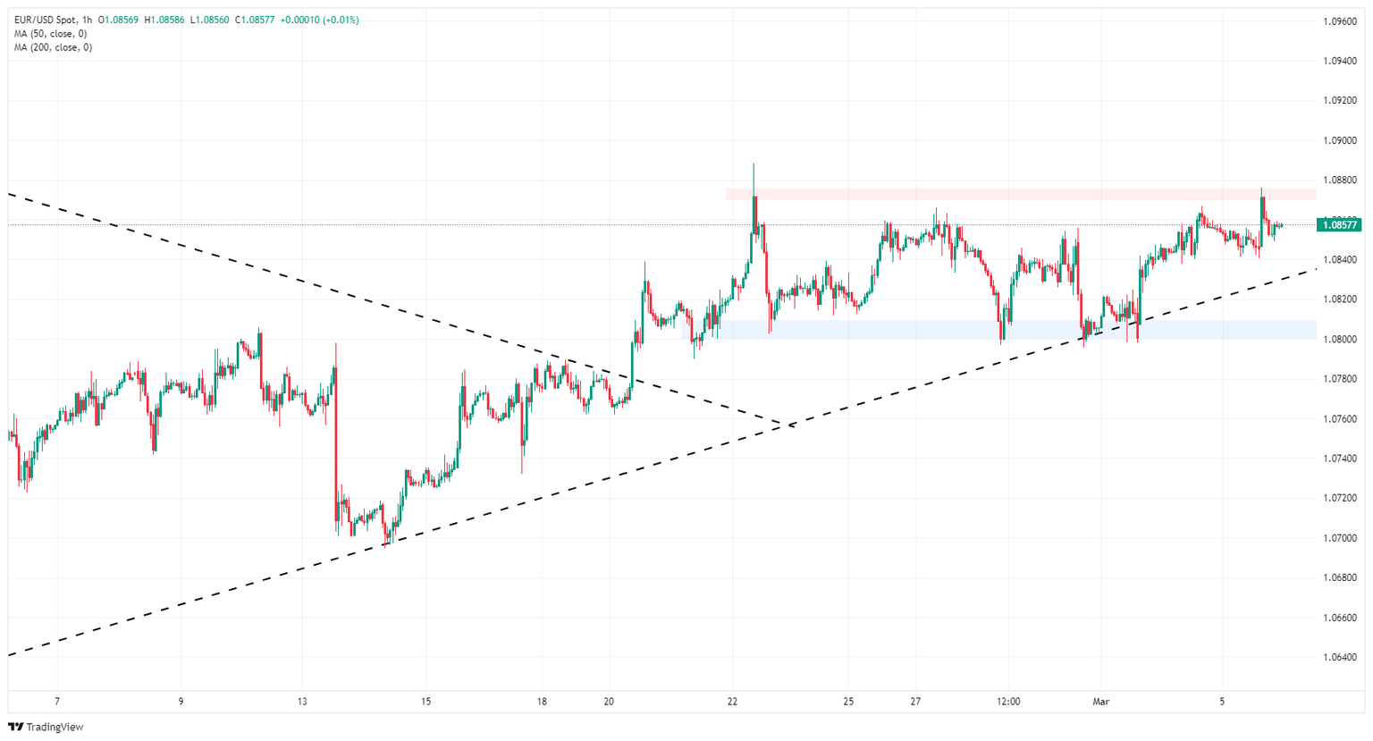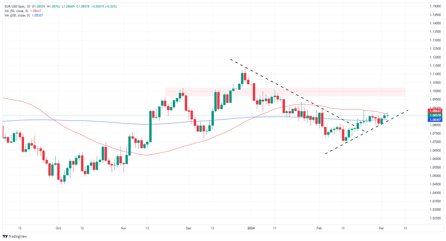 EUR/USD continues to struggle to find adequate bullish momentum to peel the pair off its 200-day Simple Moving Average (SMA) at 1.0830, and intraday bids are stuck near 1.0850. Topside gains are capped by a 50-day SMA grinding into a congestion pattern with the 200-day SMA.