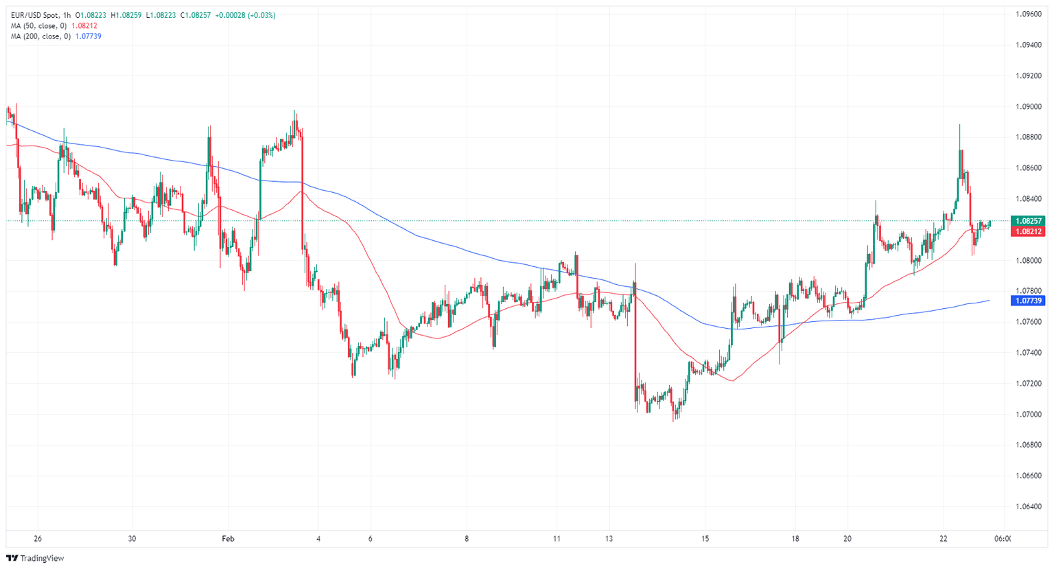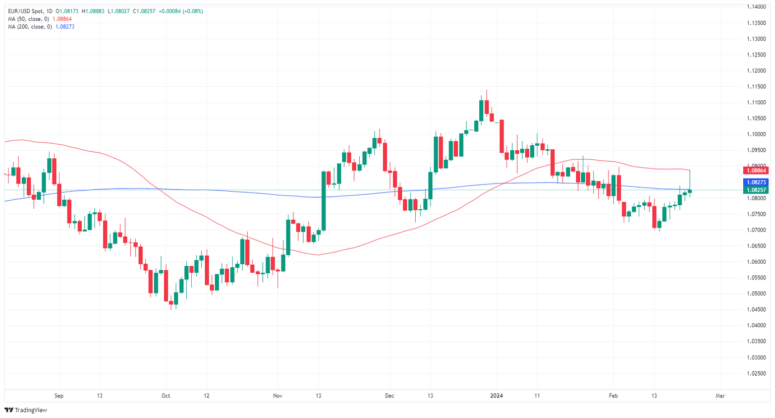EUR/USD broke higher on Thursday, testing into its highest bids since the start of February before falling back into the 1.0800 region after European and US Purchasing Managers Index (PMI) figures softened or came in mixed on forecasts. The Pan-European Composite PMI ticked higher, but the Manufacturing component fell back once again, and US PMIs also gave a mixed showing.