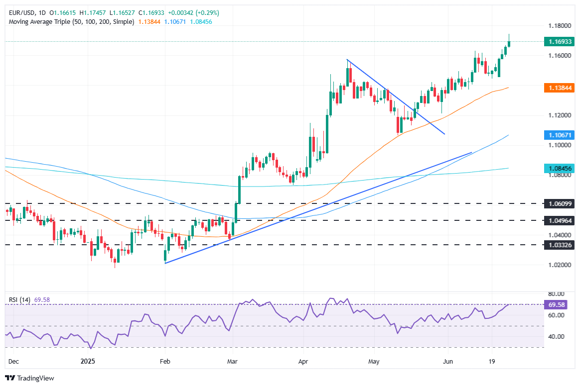 EUR/USD soars to nearly four-year highs on Thursday, extending its rally to five straight days, with the pair clearing the 1.1700 figure for the first time since September 2021. Expectations that the Federal Reserve (Fed) would lower rates sooner than expected pushed the major to yearly highs of 1.1744, before retreating to 1.1697, up 0.33%.