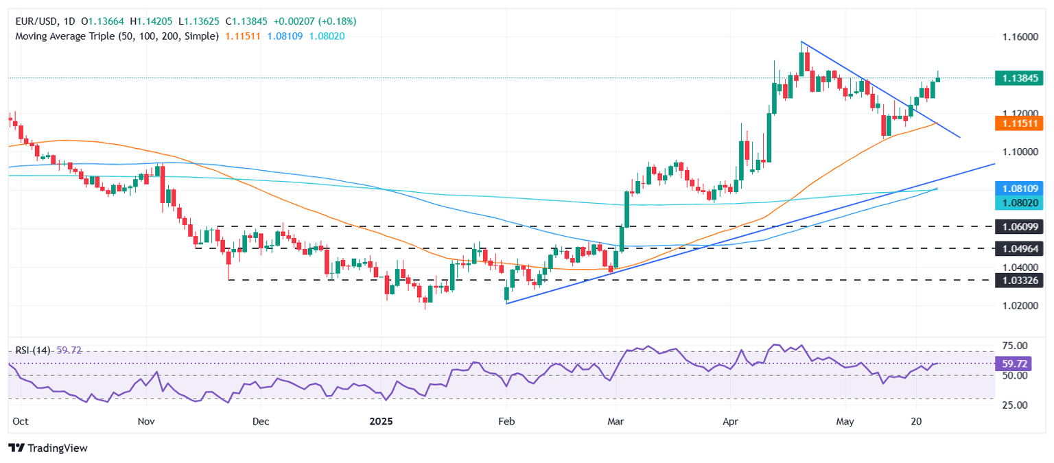EUR/USD begins the week on the front foot but trims some of its earlier gains after hitting a four-week high of 1.1420, sponsored by US President Donald Trump's reversal on his decision to enact tariffs on the European Union (EU) on June 1. At the time of writing, the major currency trades at 1.1390, up 0.20%.
