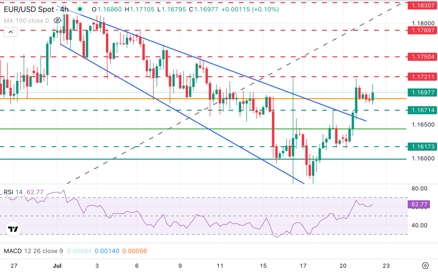 EUR/USD breaks above trendline resistance and looks at 1.1720