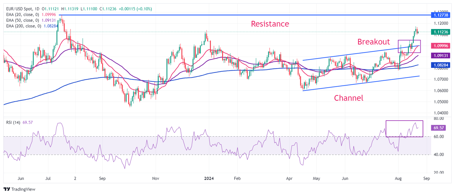 EUR/USD holds above the round-level support of 1.1100, with investors focusing on Fed Powell’s speech at the JH Symposium. The outlook of the shared currency pair has remained upbeat after a breakout of a channel formation on a daily time frame. All short-to-long-term Exponential Moving Averages (EMAs) are sloping higher, suggesting a strong uptrend.