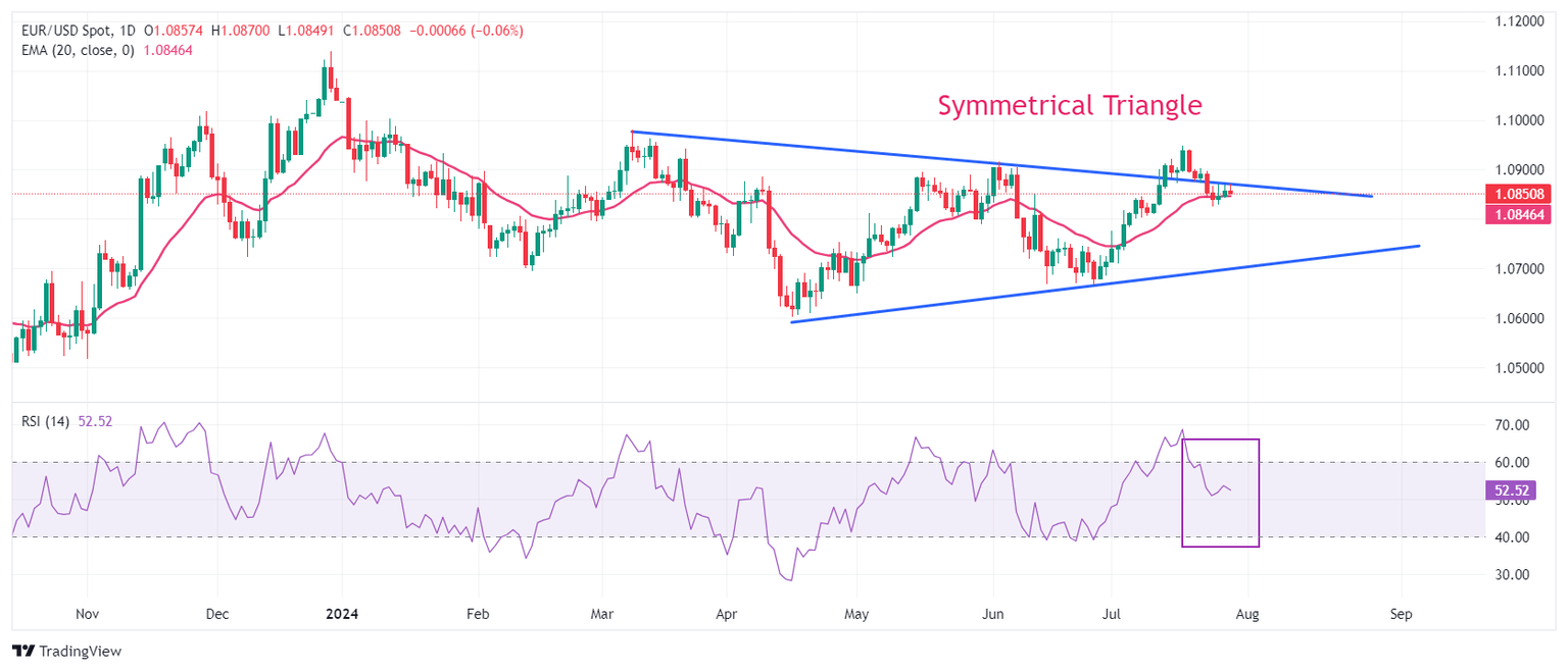 EUR/USD dips to near 1.0800. The shared currency pair remains inside a Symmetrical Triangle formation on a daily timeframe after failing to hold the breakout. The major currency pair extends its downside below the 20-day Exponential Moving Average (EMA), which trades around 1.0840. The shared currency pair could slide further towards round-level supports near 1.0800 and 1.0700.