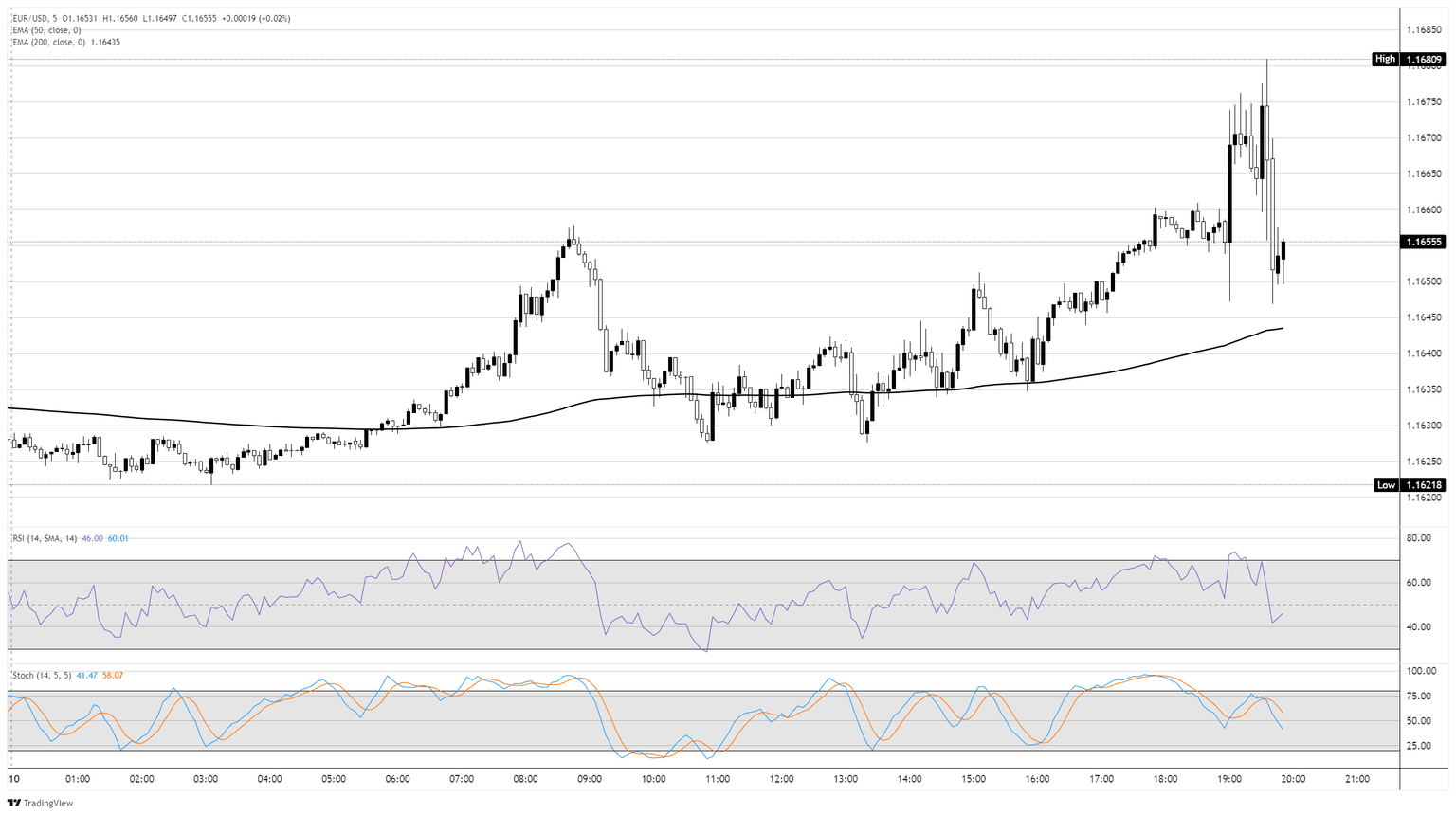 - EUR/USD lurched into intraday highs near 1.1670 after the Fed delivered a widely anticipated interest rate cut.