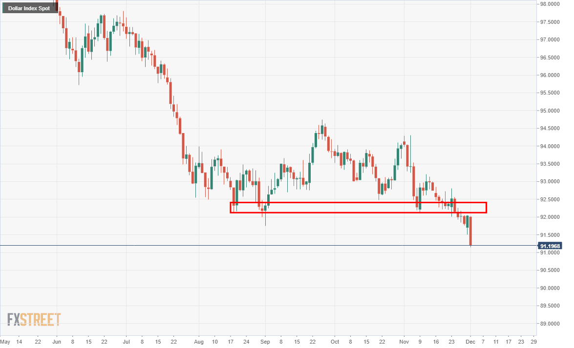 As it stands, the index is now well on its way for a break of the 91 level in a new bearish trend. The greenback has dropped to its lowest level in more than 2-1/2 years: