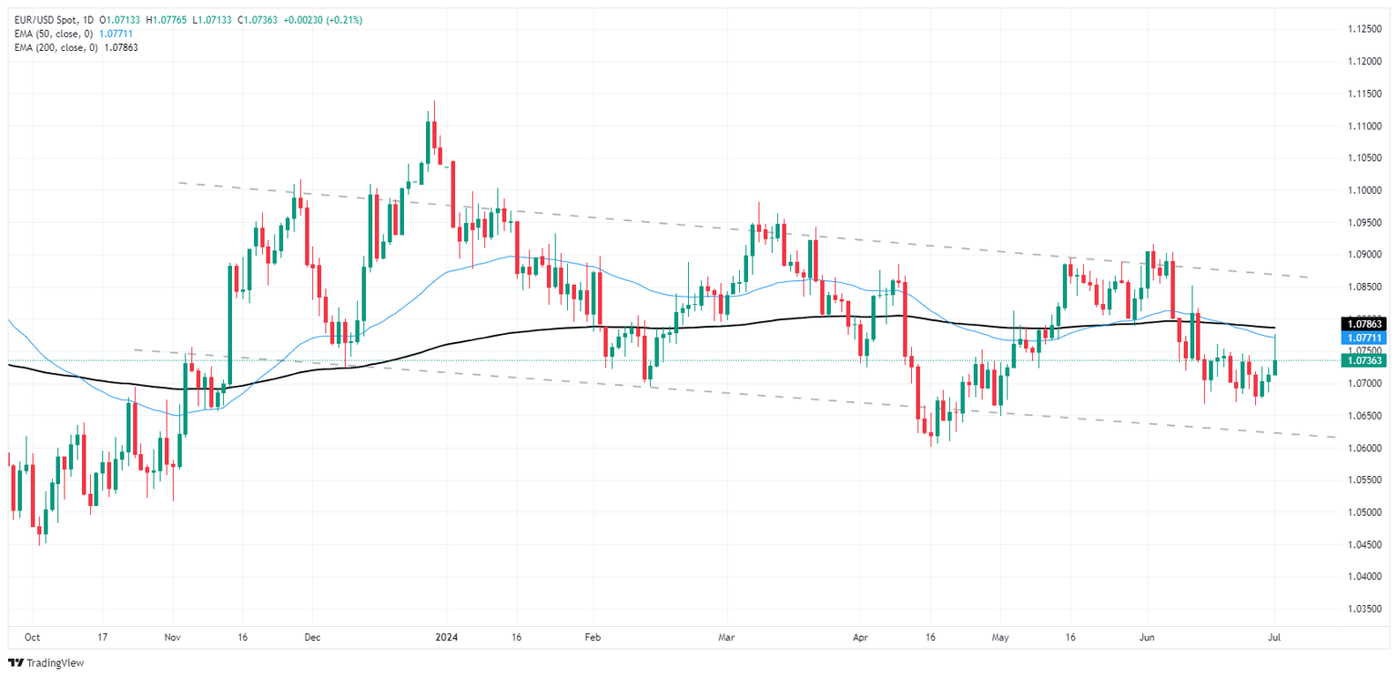 The Fiber kicked off the new trading week with a fresh push into 12-day peaks above 1.0770 before crumpling risk appetite dragged the pair back down to 1.0735. Intraday price action continues to lean into the midrange as EUR/USD grapples with the 200-hour Exponential Moving Average (EMA) at 1.0722.