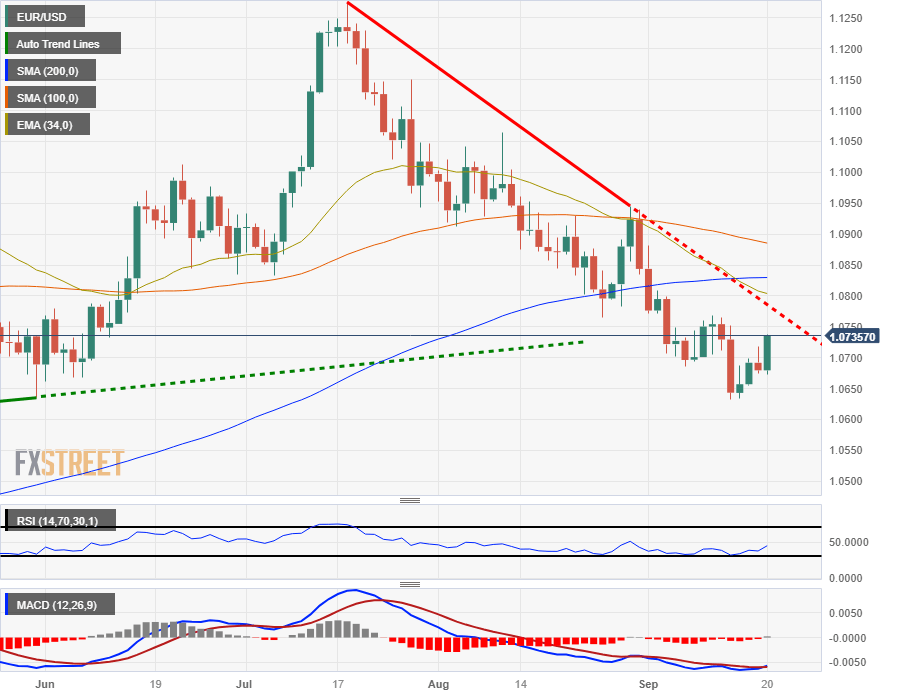 The EUR/USD pair is bouncing for Wednesday’s pre-Fed action, climbing over the 200-hour Simple Moving Average (SMA) to claim territory north of the 1.0730 level. The pair kicked off Wednesday’s trading session near 1.0680 and has done nothing but ramp up as Greenback traders hold their orders.