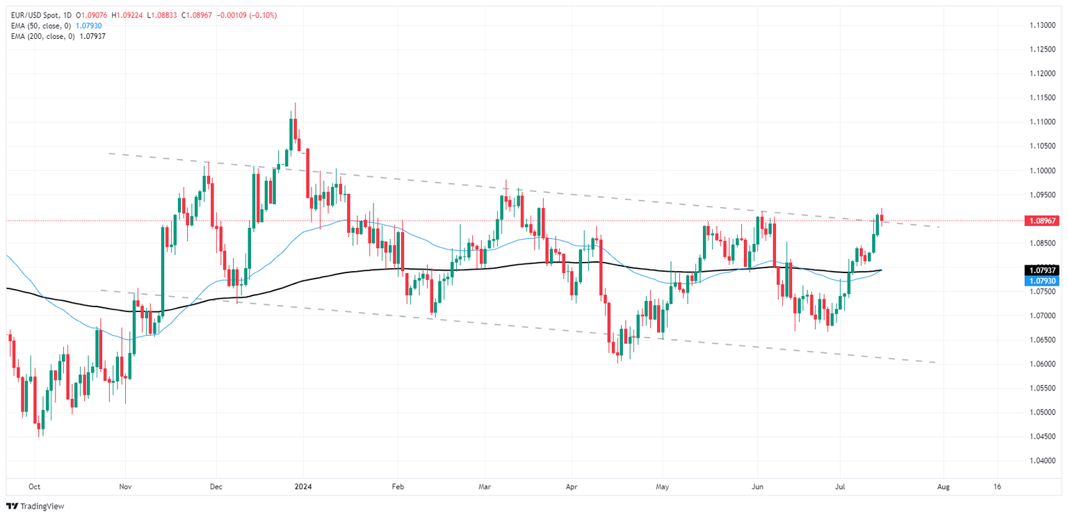 Despite tipping into a fresh 16-week high on Monday, EUR/USD flubbed a challenge of the 1.0900 handle, easing back and leaving daily candlesticks mired in technical consolidation at the top end of a rough descending channel. Fiber ended a three-day winning streak, and is poised to tumble out of a bullish stance that dragged bids into the green for all but two of the last 12 consecutive trading days.
