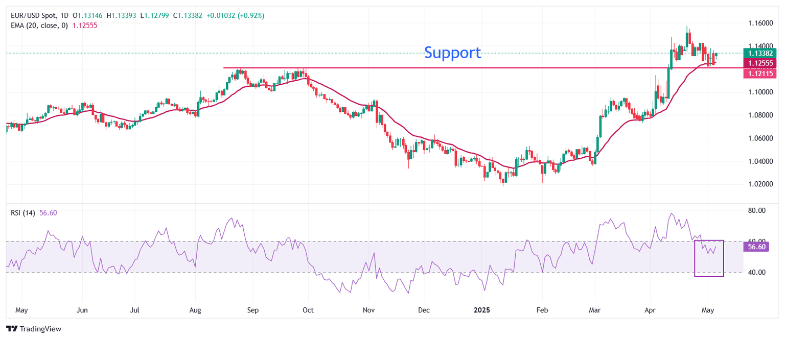 EUR/USD oscillates inside Monday’s trading range above 1.1300 on Tuesday. The 20-day Exponential Moving Average (EMA) around 1.1260 continues to act as a major support for the pair.