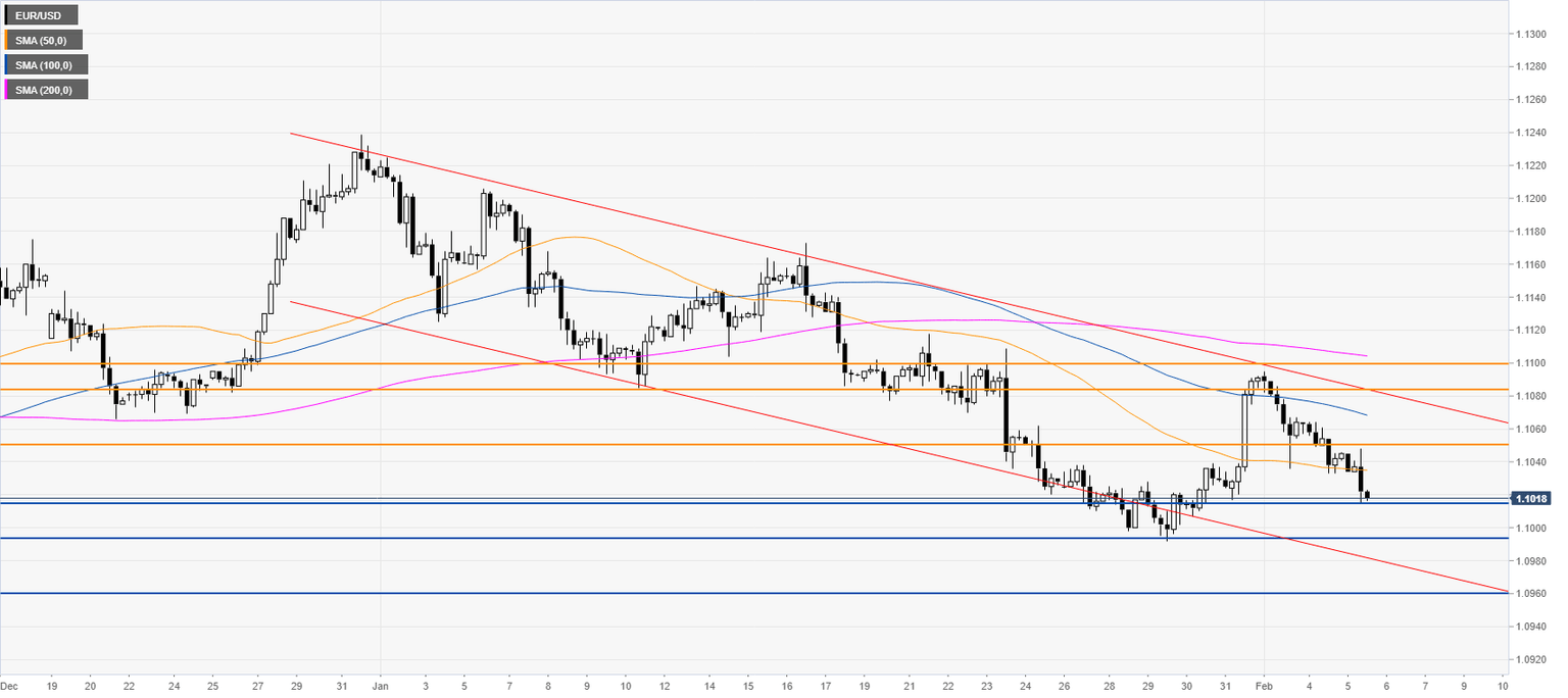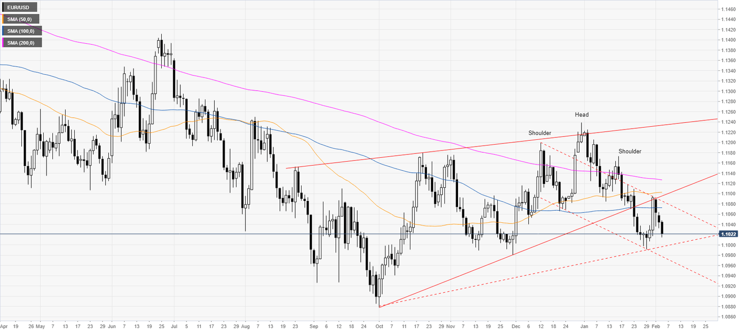 EUR/USD is trading in a bear channel below the main SMAs while challenging the 1.1016 support. As the euro remains on the backfoot, a break below the above-mentioned level is likely to lead to further weakness towards the 1.0993 and 1.0959 levels, according to the