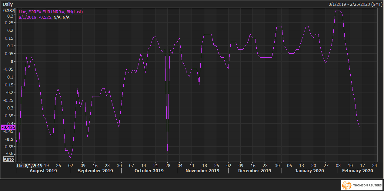 One-month risk reversals (EUR1MRR), a gauge of calls to puts, crossed below zero on Feb. 10 and fell to -0.425 on Friday, the lowest level since Oct. 29, 2019.