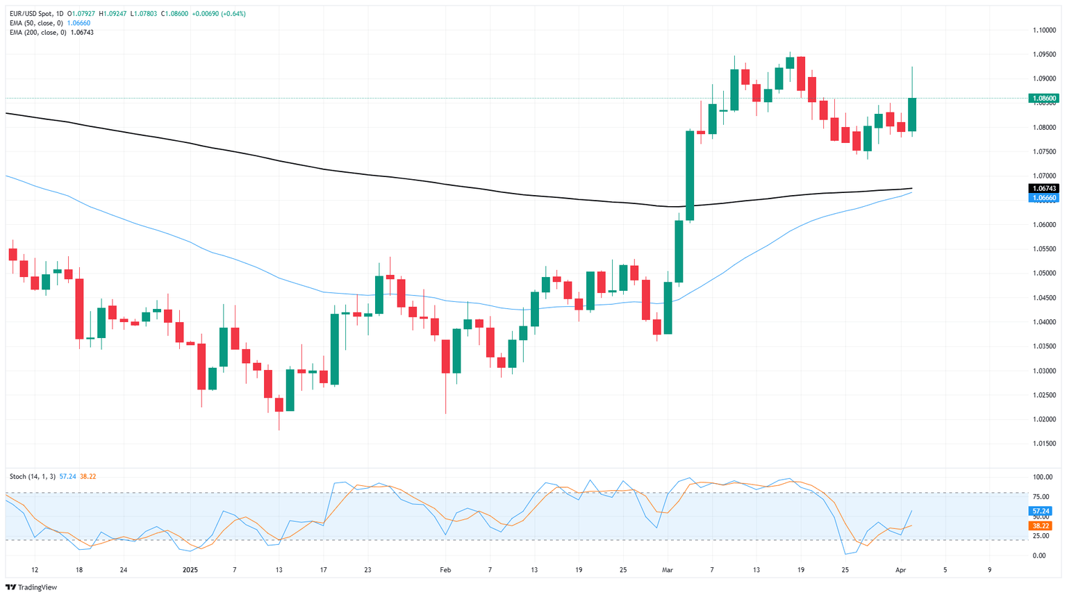 On Wednesday, the EUR/USD pair saw a bullish surge after the Trump administration announced tariffs that turned out to be less severe than many investors had anticipated, given President Donald Trump’s barrage of tariff threats over the last 72 days. While the specifics of these tariff proposals are intricate, US consumers should prepare for a uniform 10% tariff on all imports, a hefty 25% tariff on all cars and car parts, and varying' reciprocal” tariffs imposed at different rates depending on the country.