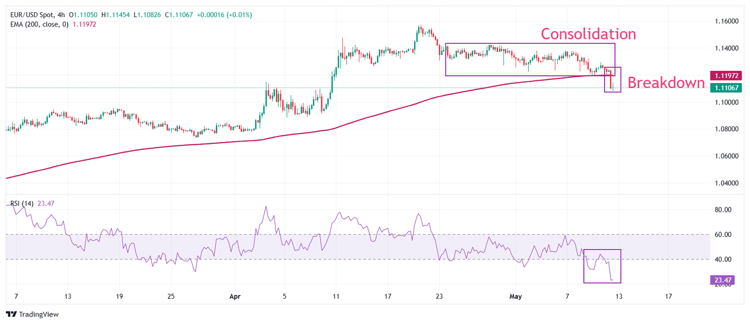 - EUR/USD slides below 1.1100 as the US Dollar rallies after the US and China agreed to lower tariffs by 115% for 90 days.