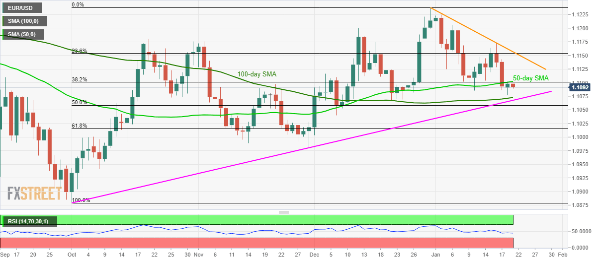 EUR/USD declines to 1.1090 during early Tuesday. That said, the pair failed to cross the confluence of 50-day SMA and 38.2% Fibonacci retracement of its October 01 to December 31 rise during the previous day.