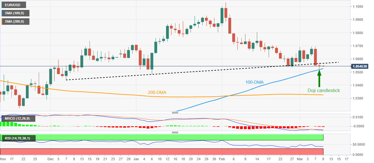 EUR/USD Price Analysis: 100-DMA, Doji candlestick prod bears around mid-1.0500s