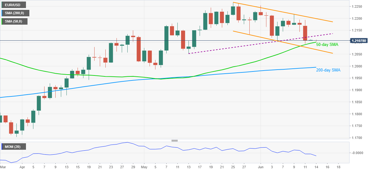 EUR/USD defends the 1.2100 threshold while taking rounds to 1.2110 during Monday’s Asian session. The pair dropped below an ascending support line from May 13. However, 50-day SMA (DMA) restricts the quote’s short-term downside.