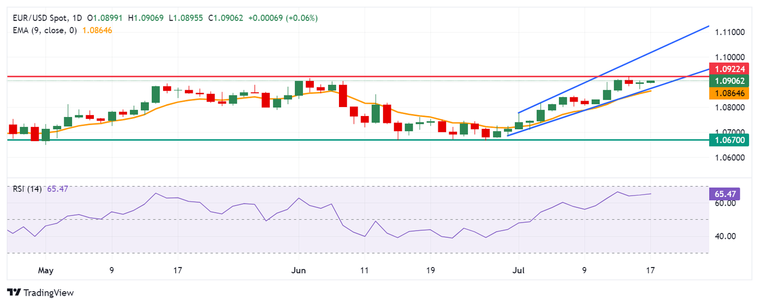 EUR/USD advances for the second consecutive day, trading around 1.0900 during Wednesday's Asian session. The analysis of the daily chart shows a bullish trend, as the pair remains within an ascending channel.
