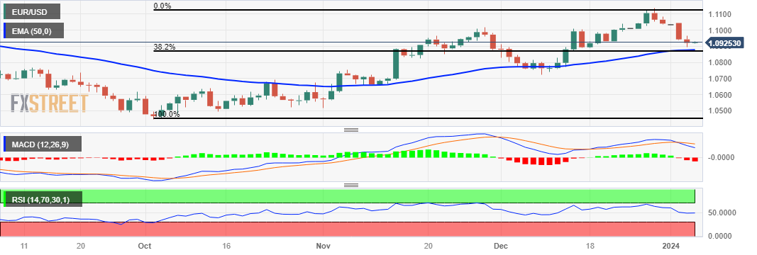 - A break below 1.0900 could lead the pair to approach the 50-day EMA at 1.0878 and 38.2% Fibonacci retracement at 1.0867.
