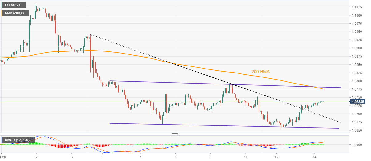 It’s worth noting, however, that a convergence of the 200-Hour Moving Average (HMA) joins the top line of a one-week-old descending trend channel to offer a tough nut to crack for the EUR/USD bulls around 1.0780.