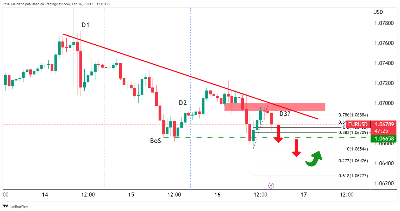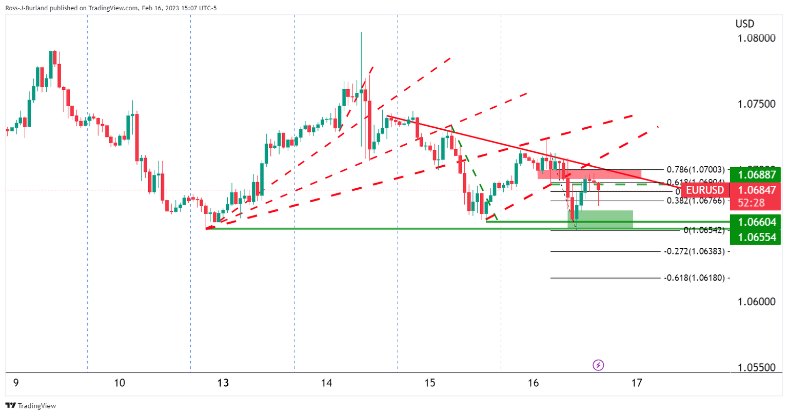 EUR/USD bulls have come up for air near 1.0700 to a US session high of 1.0697 to meet resistance, both horizontal and dynamic. The US Dollar came under pressure again despite a slew of inflationary data over the last several days and the EUR/USD bears are out in force: