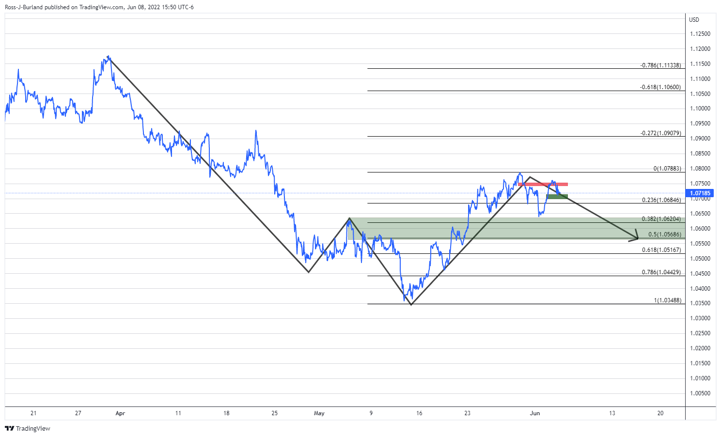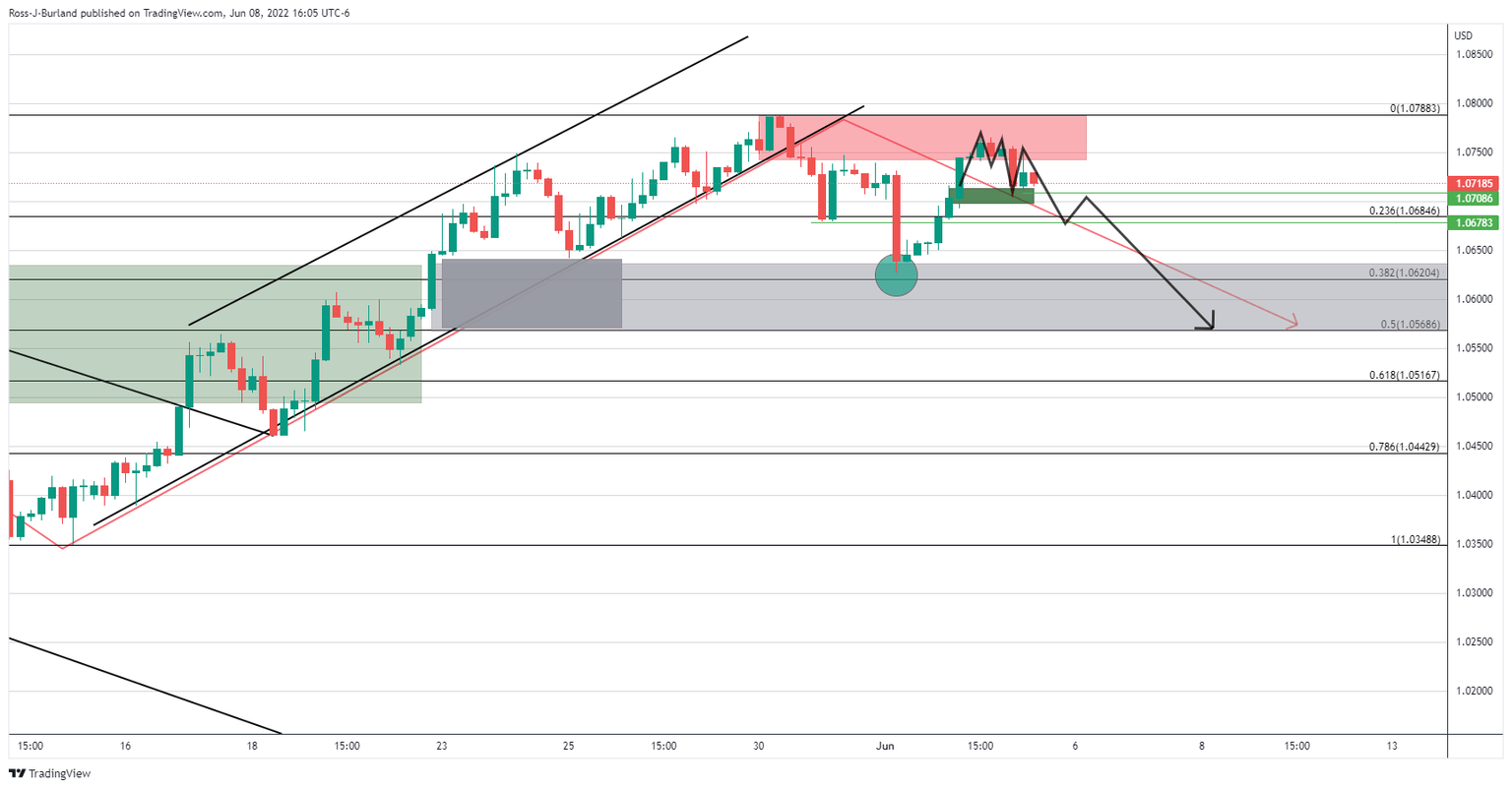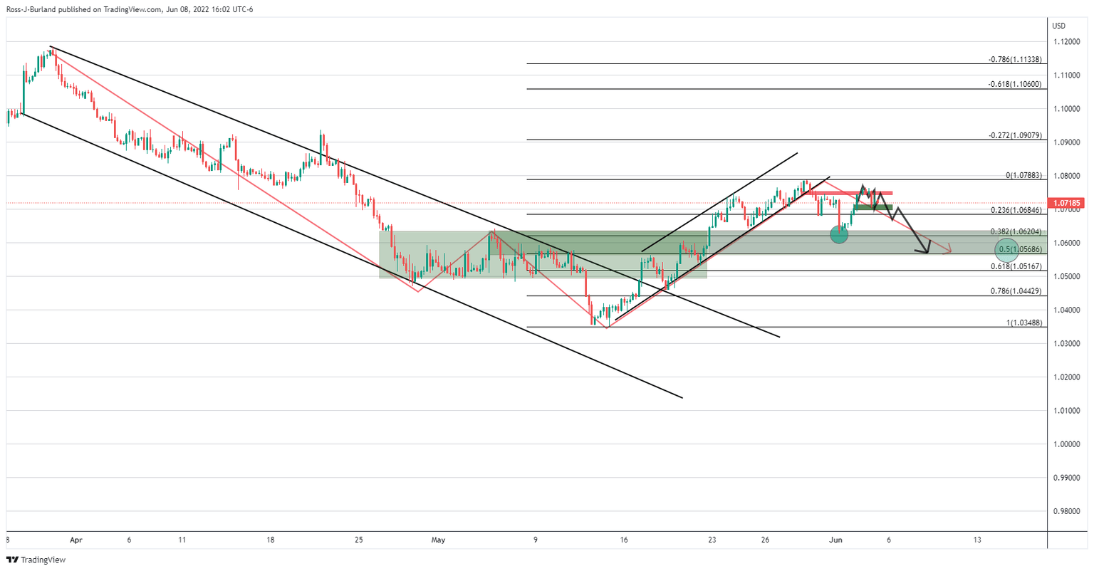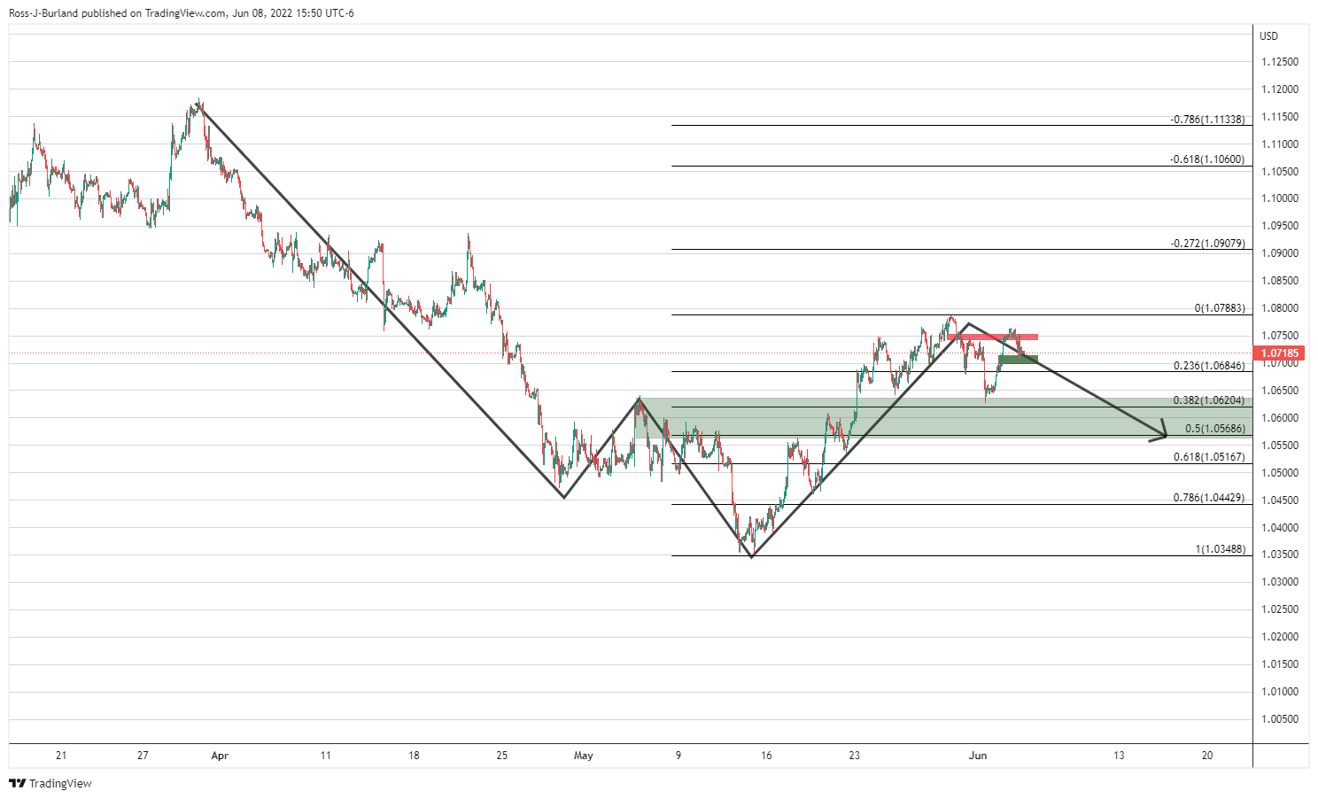 EUR/USD is displaying a bearish bias on the weekly chart which can be analysed on a lower time frame for prospects of a deeper correction in the days ahead. The following illustrates the market structure on a multi-timeframe basis: