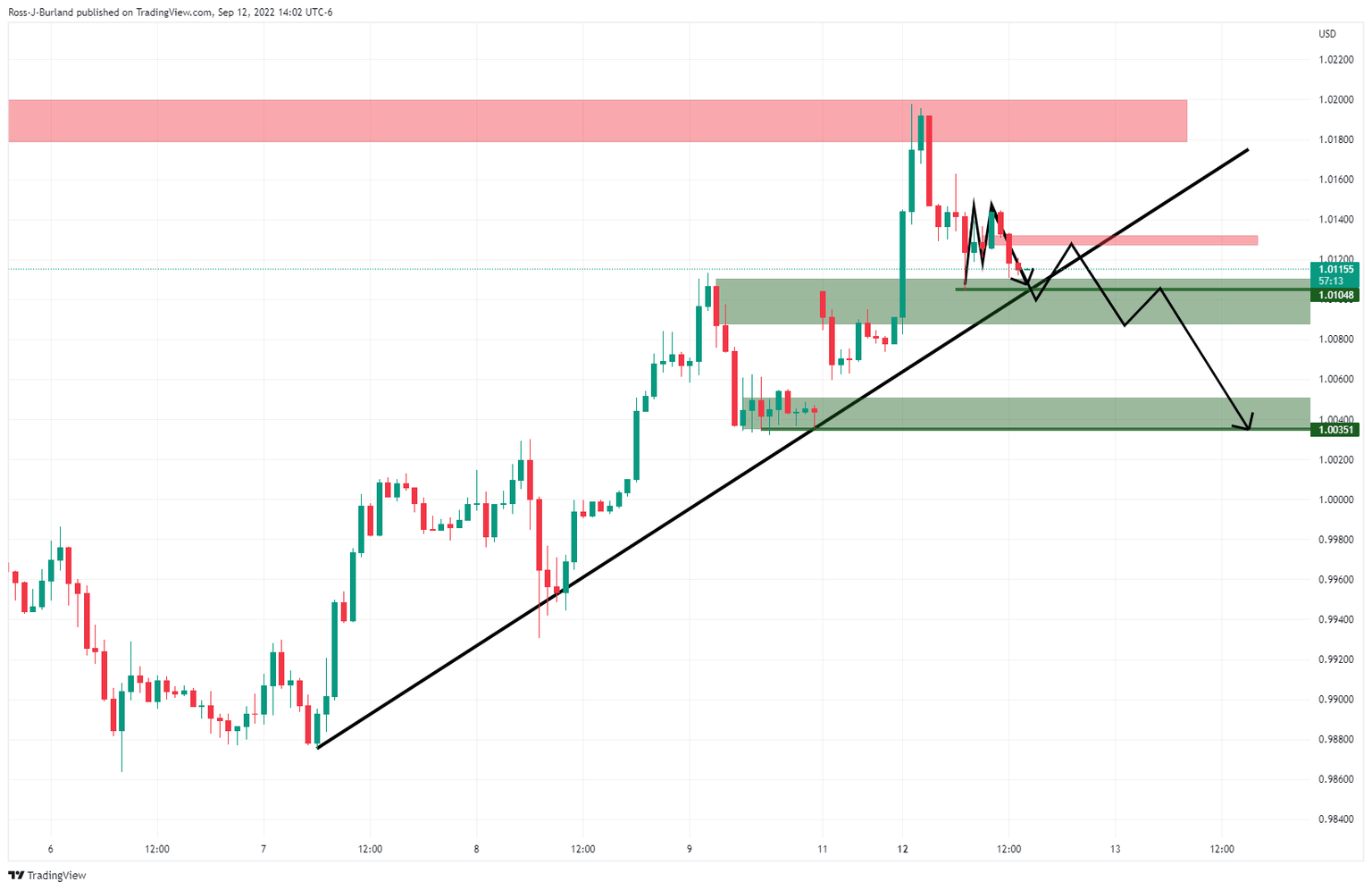 First, 1.0105 needs to give. A retest of the current M-formation's neckline could be first in line and if that were to hold, the bears will have the ammunition required to take on the bull's commitments around 101 the figure.