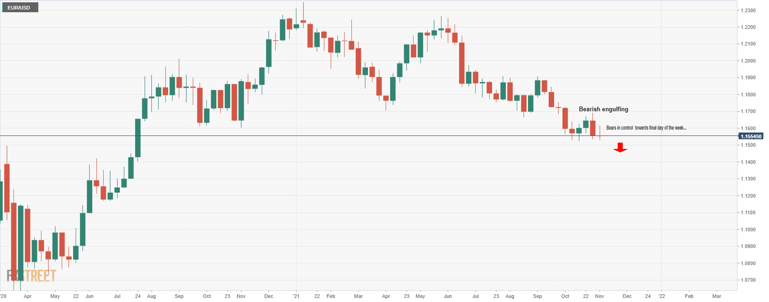 Firstly, casting eyes over prior analysis, EUR/USD Price Analysis: Bears seeking a break below 1.15 the figure, the weekly chart was analysis as follows, forecasting a bear trend to test into the weekly fractal highs of the spring and summer below 1.15 the figure: