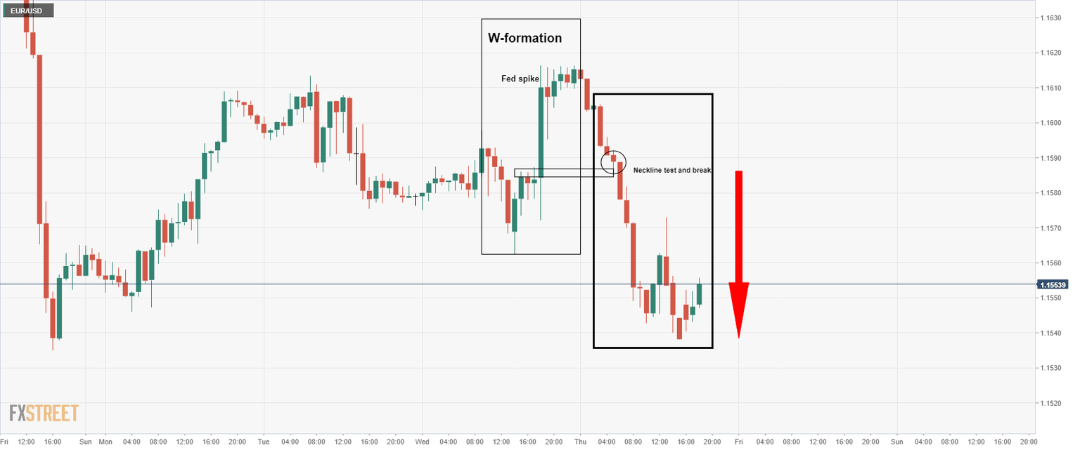 The W-formation was a compelling bearish reversion pattern that left the downside vulnerable and which has resulted in a break of support and given way to follow-through on Thursday as follows:
