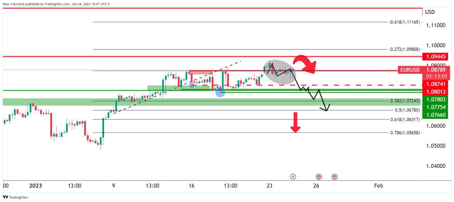 - EUR/USD bullish rally has faded and a topping pattern is in play.