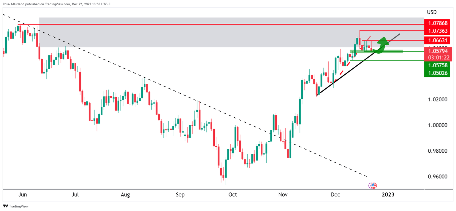 EUR/USD is moving in towards a price imbalance between 1.0580 and 1.0560 having already made a low of 1.0582. The price is coiled below the top of the bullish cycle up at 1.0763 and is breaking down the trend which leaves the bias to the downside. The following illustrates the prospects of an explosive move below trendline support and given the holidays, a narrow range could be the fuel for the same in the full trading days between Christmas and New Year.