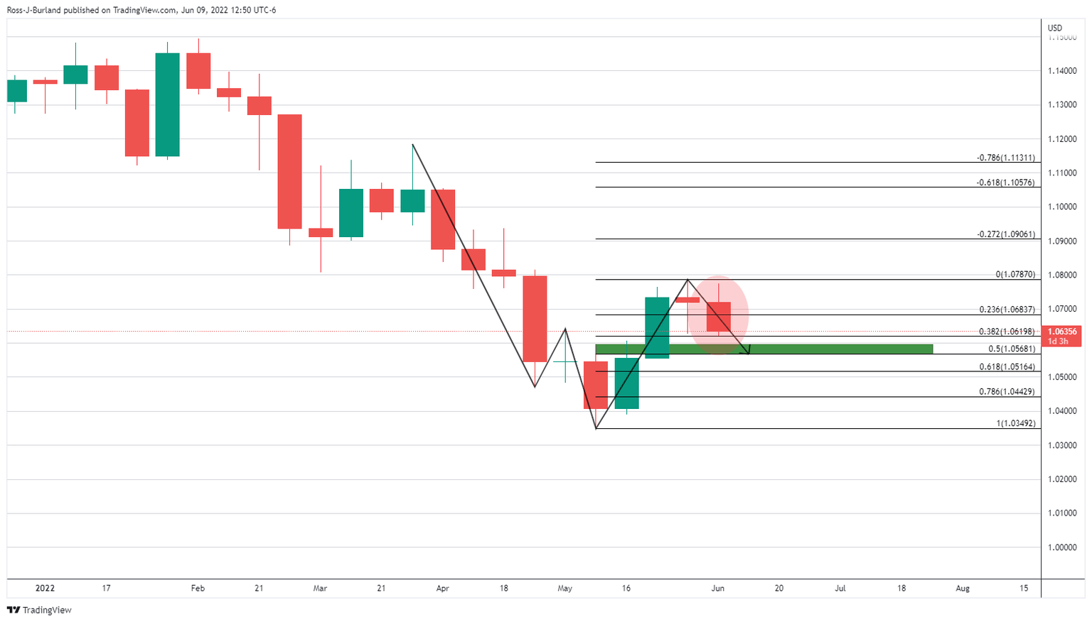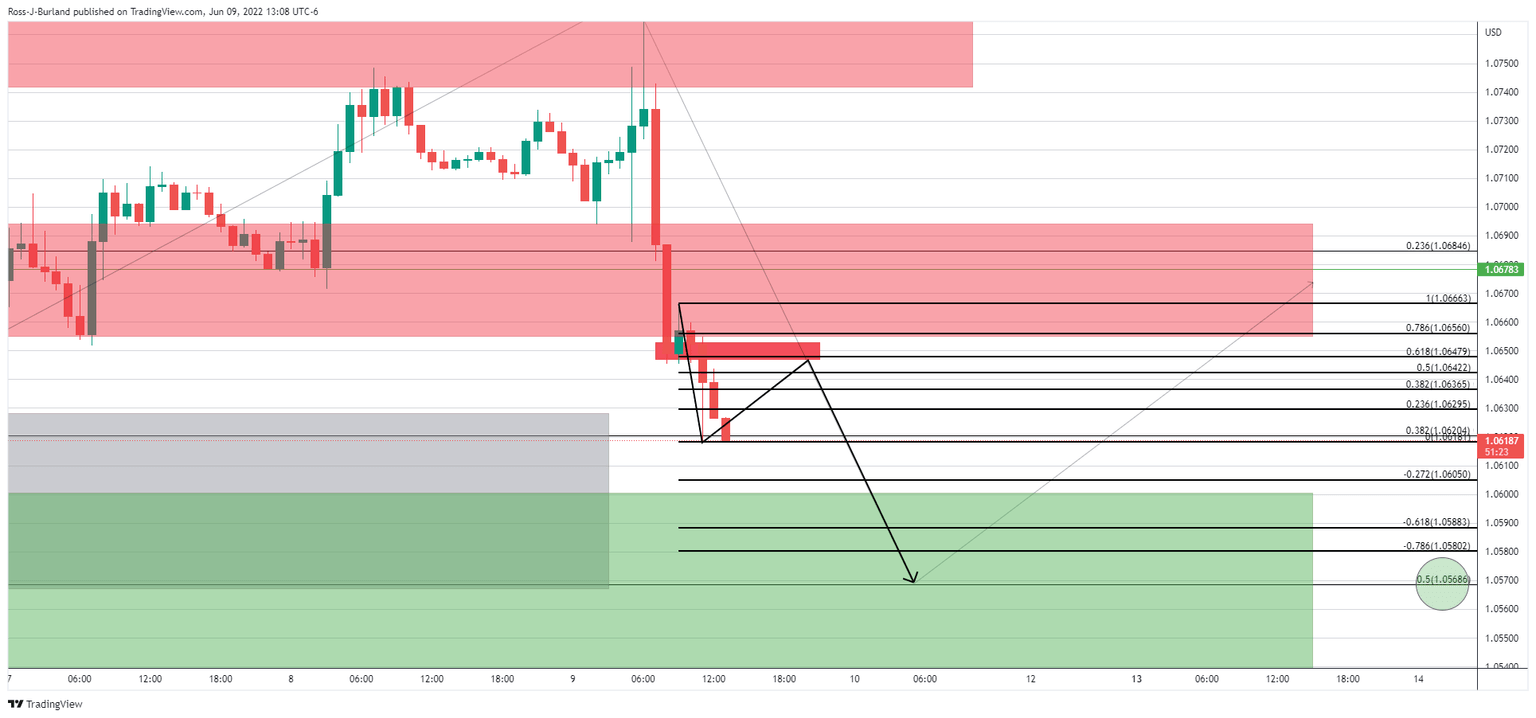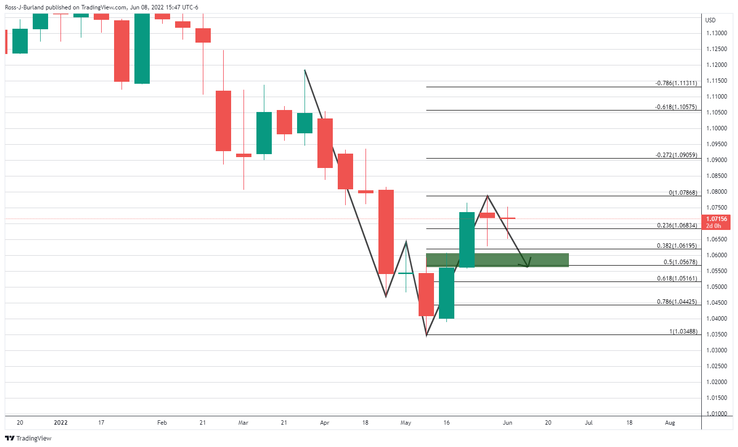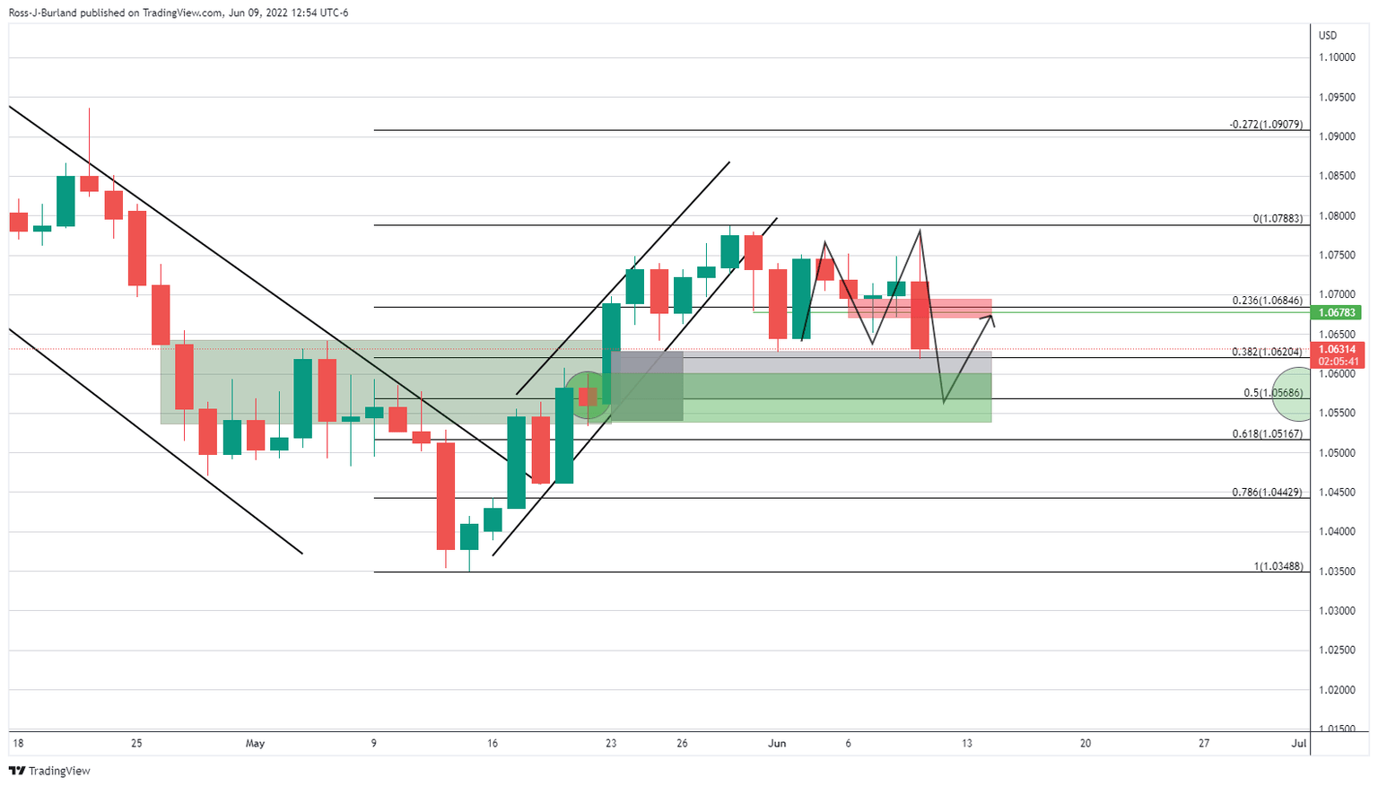 From a daily perspective, there is an M-formation being formed from Thursday's price action. However, while this too is a reversion pattern, there is a price imbalance between June 1's low and May 20 lows of 1.0532 that the bears are embarking on. Mitigation of this price area, around 80 pips to the downside, could play out over the course of the next sessions if bears stay in control.