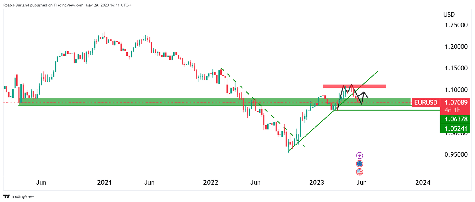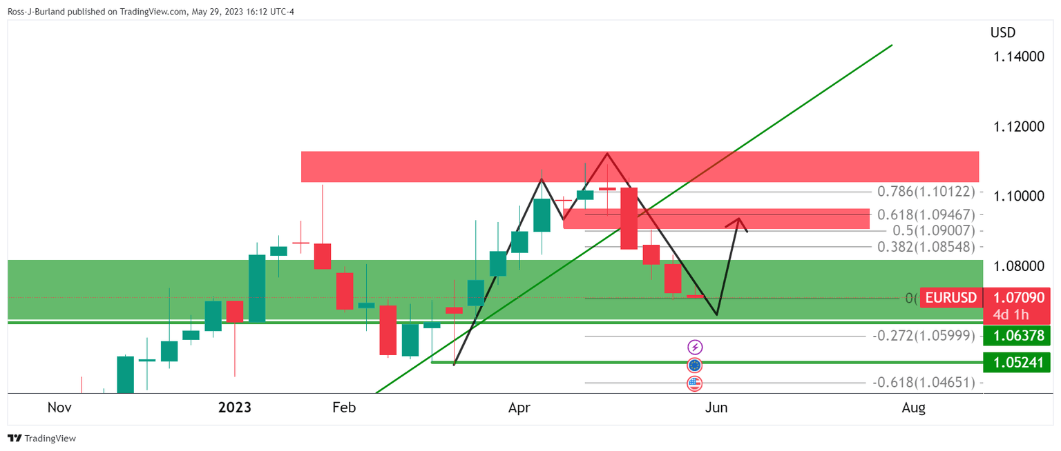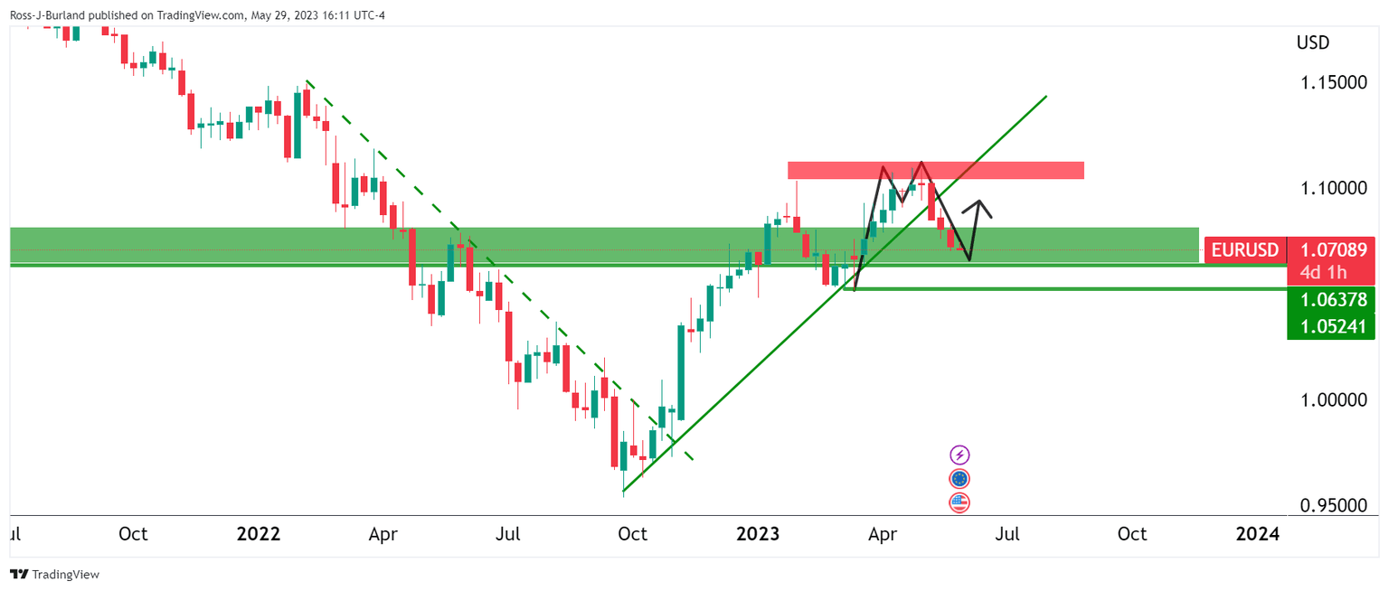 EUR/USD was pressured on Memorial Day, with the price falling from 1.0743 to a low of 1.0705 as the US Dollar’s 4-day winning streak lives on that is now up some 3% vs. the Euro. The following analysis shows the price sliding out of the bullish rally toward prior support.