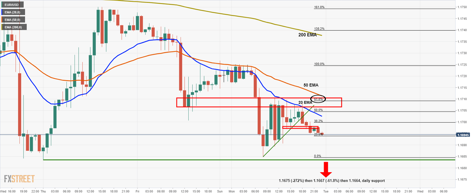 At this juncture, bears will be monitoring for a break of the dynamic trendline support for a potential downside extension towards the said daily supports. However, bears would be prudent to note the hourly support below the dynamic trendline support at 1.1697 and only engage in full below there. Besides the daily supports, there are -272% and -61.8% Fibonacci retracements targets as being 1.1675 and 1.1667 respectively.''