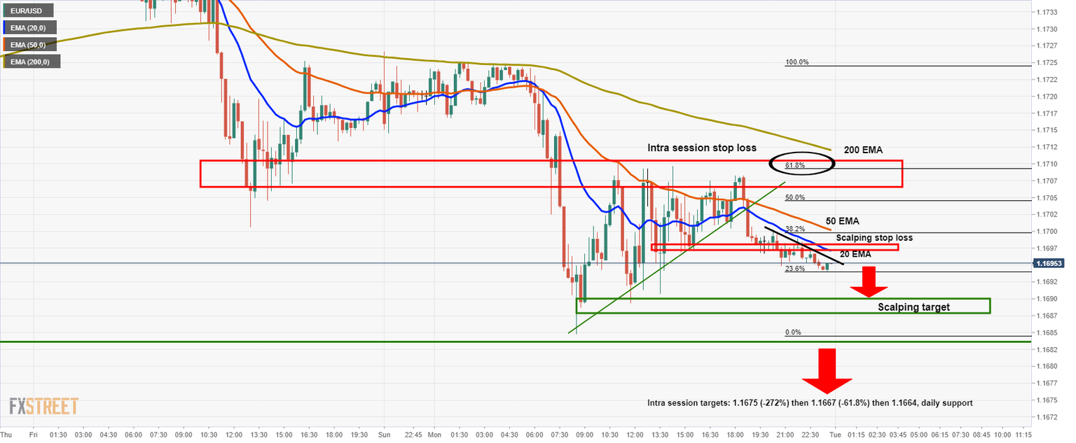 ''As illustrated in the hourly chart above, the price has pulled back into resistance as marked by the 20-EMA and the confluence of the 61.8% golden Fibonacci level. While below the 200 and 50 EMAs, the price is in bearish territory, so this may be regarded as a discount to the bears targeting daily support near 1.1680 ahead of 1.1664.