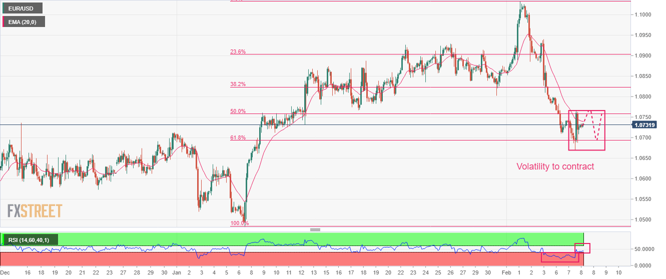 EUR/USD has turned sideways after a wild movement post commentary from Federal Reserve (Fed) chair Jerome Powell on interest rate guidance. The major currency pair is expected to witness a sheer contraction in volatility ahead, which will result in wider ticks and heavy volume after an expansion in the same.