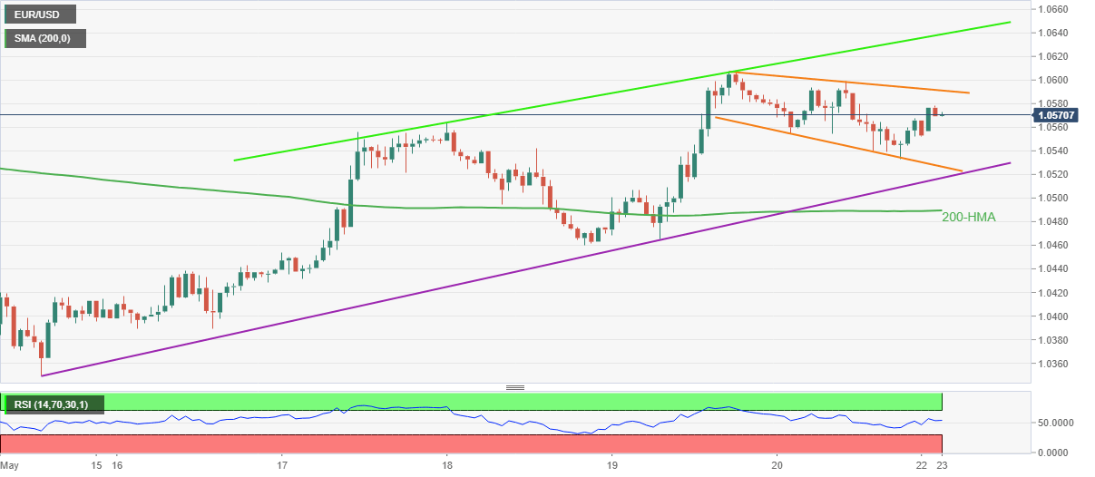 Also acting as immediate support is an upward sloping trend line from May 13, close to 1.0515, as well as the 200-HMA level of 1.0490.