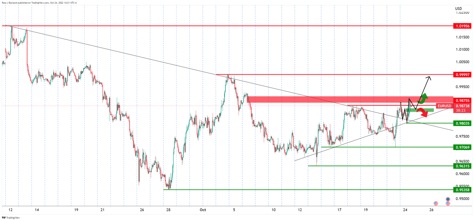 The hourly chart shows that the price is stalling within the W-formation but should bulls commit at 0.9850, we could see the makings of a breakout structure to cement the bullish case going forward.