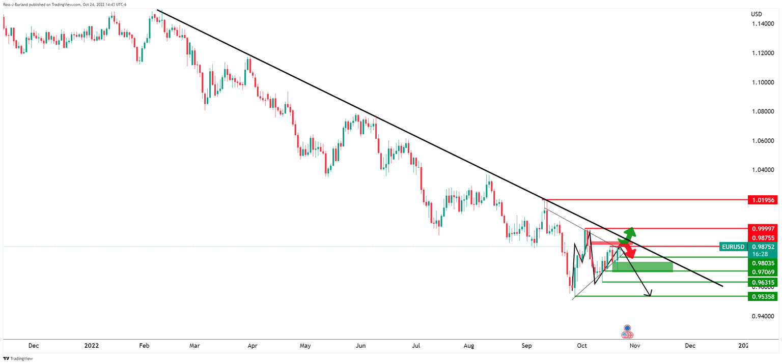 EUR/USD's daily chart is indeed bearish while below the trendline resistance. The price is on the verge of a break of structure as per the triangle coil as it moves in on the resistance in a creeping bullish short-term trend.