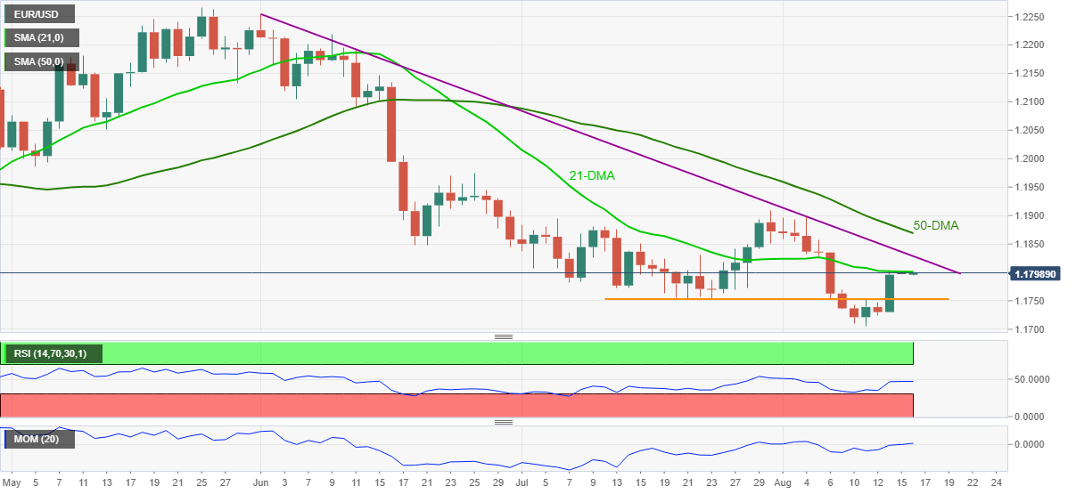 - EUR/USD bulls battle 21-DMA after Friday’s upbeat performance.