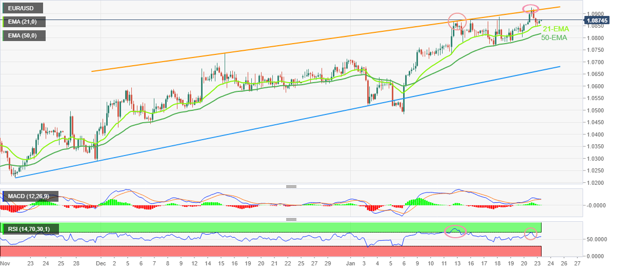 EUR/USD resumes run-up towards the short-term key hurdle as it rises to 1.0875 during early Tuesday, following a retreat from the nine-month high amid late trading hours of the previous day. In doing so, the major currency pair bounces off the 21-Exponential Moving Average (EMA), around 1.0850 by the press time.