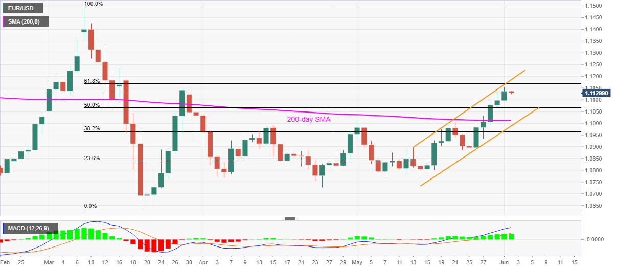 EUR/USD fades upside momentum while taking rounds to 1.1130 amid Tuesday’s Asian session. Although a short-term ascending trend channel formation seems to keep the bulls hopeful, 61.8% Fibonacci retracement of March month’s fall likely questions the pair’s further upside.