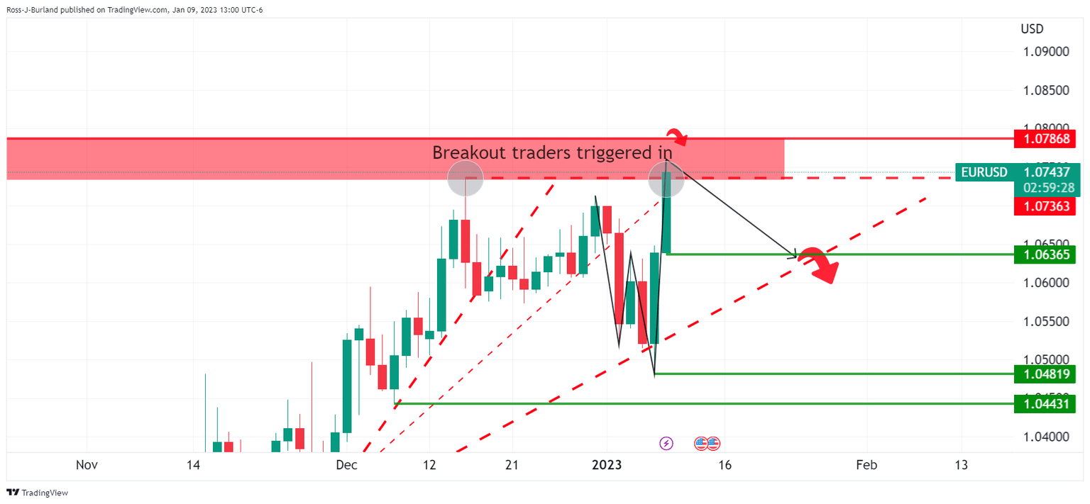 However, as illustrated at the start of the week's technical analysis, EUR/USD Price Analysis: Breakout traders triggered long, bears looking to pounce, we have red news on the calendar on Thursday that marries up with a technically bearish fo5rmation on the charts as the following will illustrate. Bulls could be running into a trap and as analysts at Brown Brothers Harriman explained, who continue to believe markets are underestimating the Fed; ''it's hard to reconcile a risk rally with deep US yield curve inversion.''