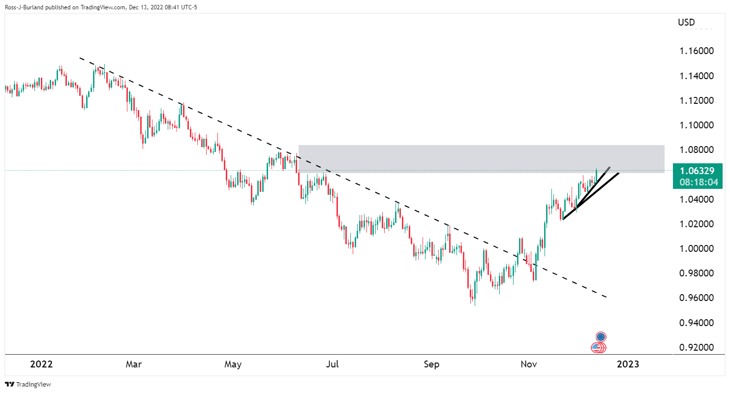 As per the prior analysis, EUR/USD soars as US CPI comes in below expectations, EUR/USD has continued to test higher in the 1.06 area, taking on the support quarter to reach a high of 1.0671 as the following analysis illustrates.